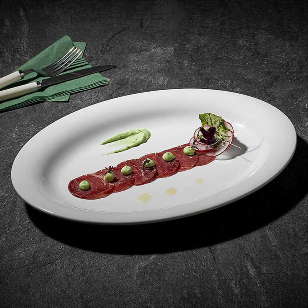 Oval şekliyle masanıza modern bir hava katan bu tabak, özellikle özel davetlerde ve restoran sunumlarında mükemmel bir seçenektir. Zarif tasarımıyla yemeklerinizi daha çekici hale getirir.