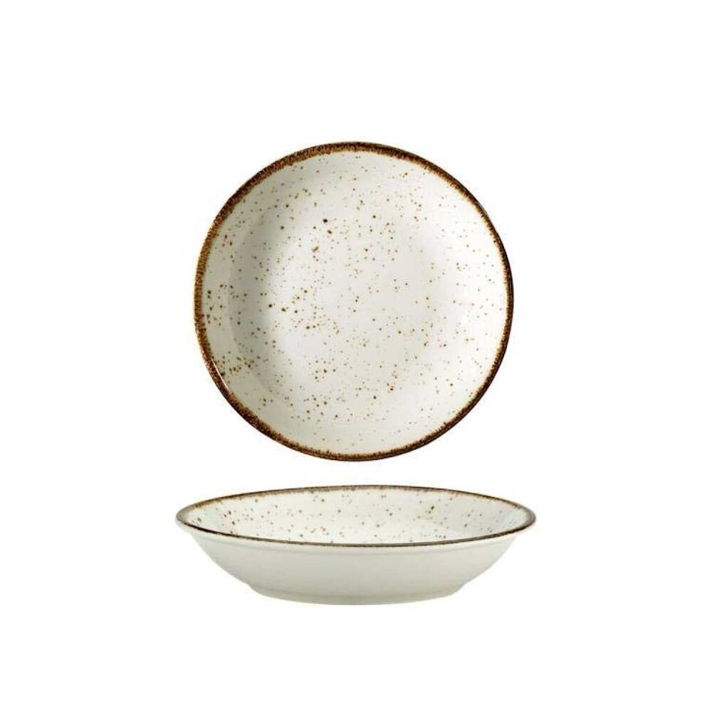 Kütahya Porselen Atlantis Enternasyonel Çukur Tabak Benekli Krem 200 mm, özel tasarımı ve dayanıklılığı ile yemek sunumlarınızda şıklık ve pratiklik sağlar. Çukur tabak tasarımıyla özellikle sulu ve soslu yemeklerin sunumu için idealdir.