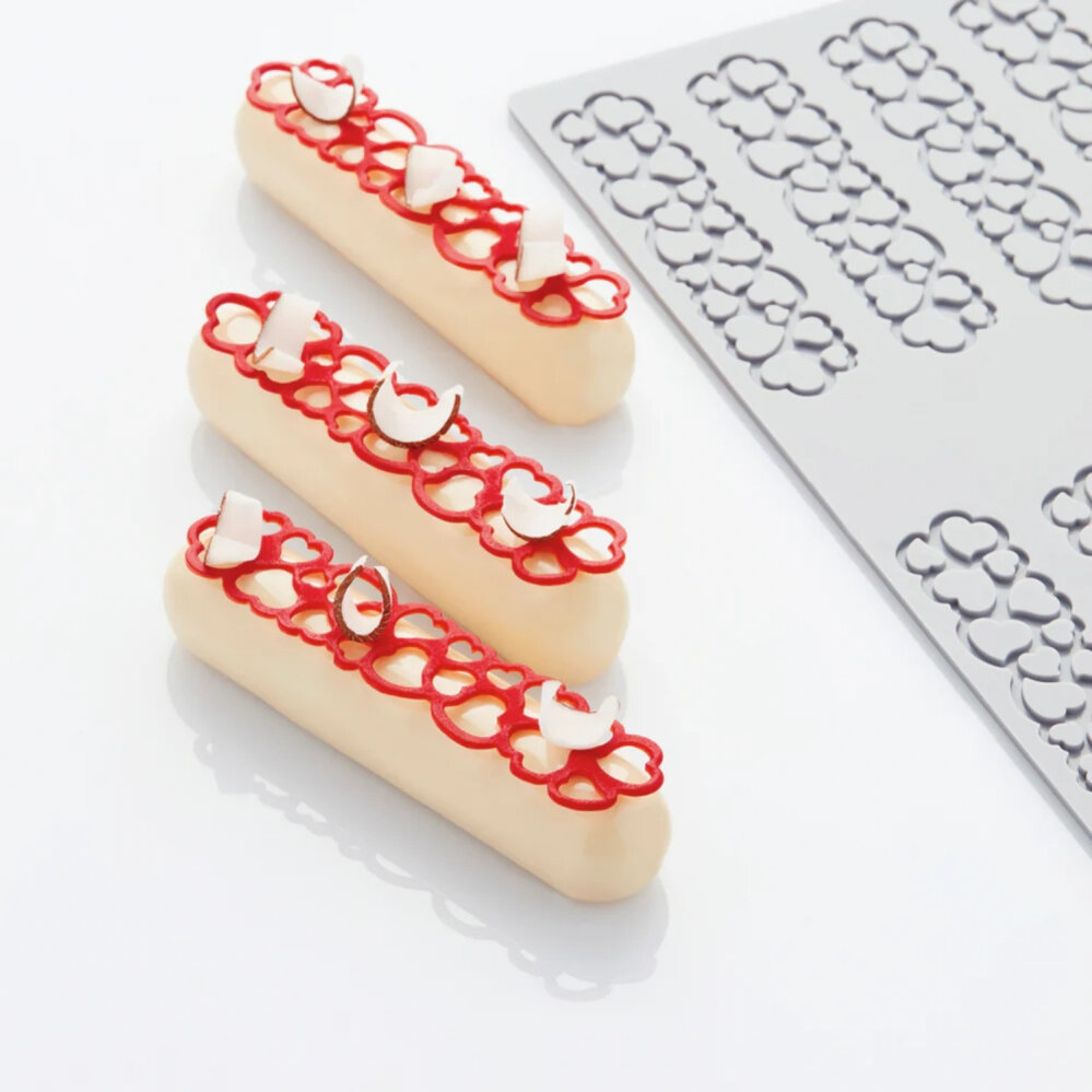 Pavoni Pavodecor, profesyonel pastacılıkta dekoratif ve şık yüzeyler yaratmak için tasarlanmış çok amaçlı bir silikon kalıptır. 3D detayları sayesinde mousse, çikolata veya kek gibi tatlılara estetik bir görünüm kazandırır.