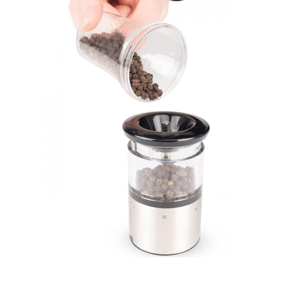 Dayanıklı ve Şık Tasarım: Paslanmaz çelik gövde, modern mutfaklara uyum sağlayan zarif bir görünüm sunar. Akrilik pencere, baharatların seviyesini takip etmeyi kolaylaştırır.
